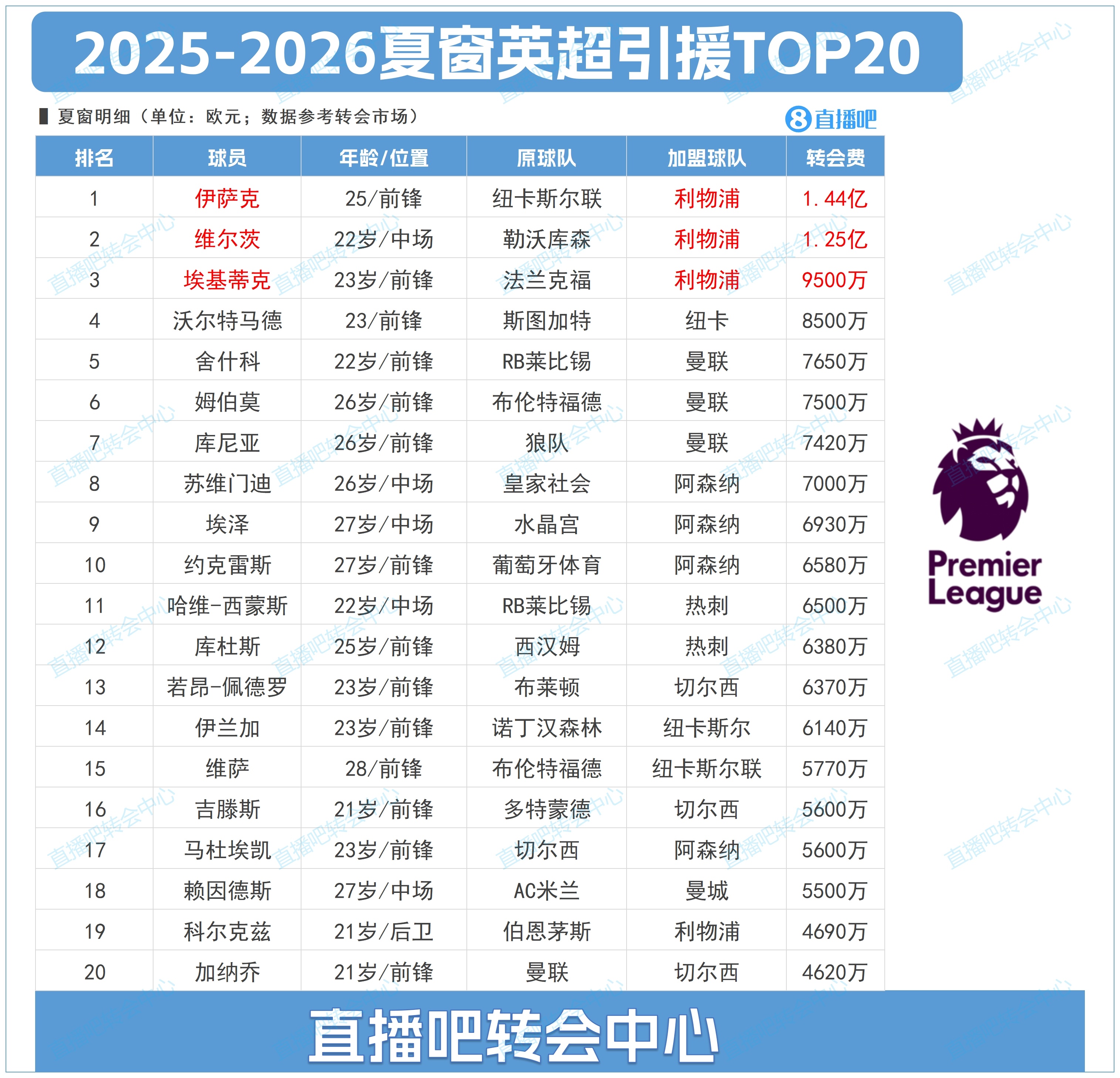 09月14日讯 夏窗英超引援TOP20中总共有6名五号位,目前还剩伊萨克和舍什科没有为新东家得分 ,以下为详细数据。