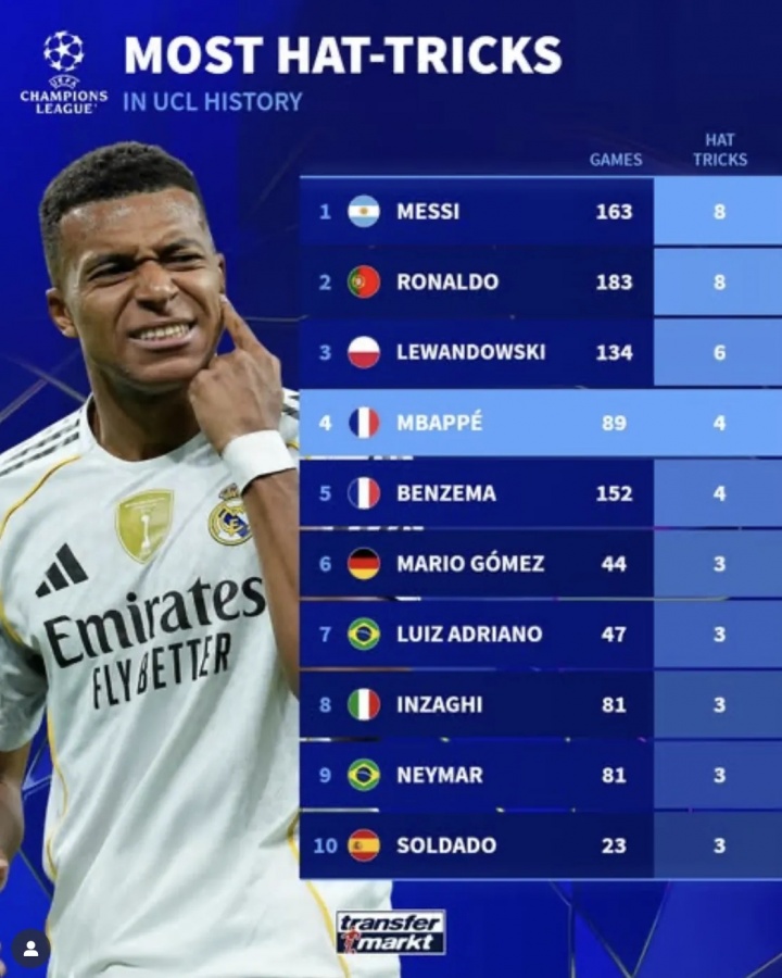 10月1日讯 在本轮欧冠,皇马5-0大胜阿拉木图凯拉特,欧洲杯直播吧姆巴佩上演独中三元,以下为欧冠历史上演独中三元次数榜:
