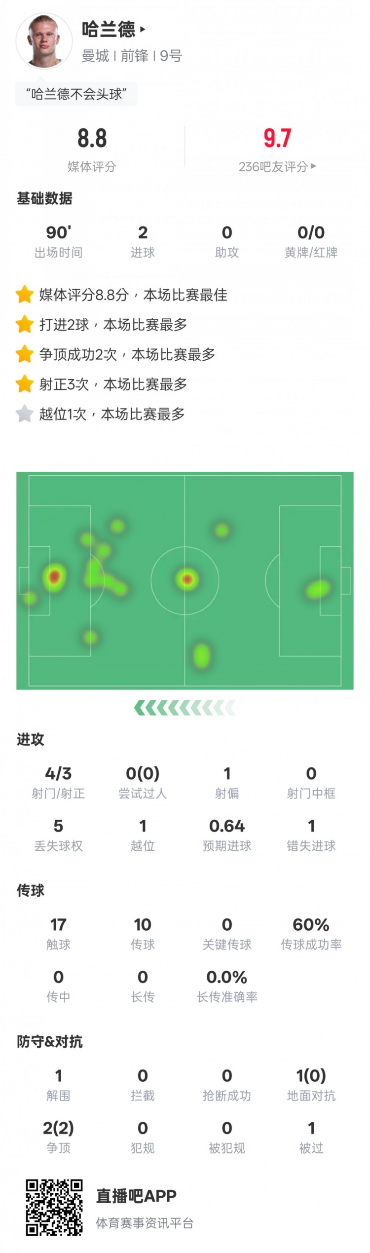 10月2日讯 欧冠职业联赛 阶段第2轮,曼城客场应战 2-2摩纳哥,哈兰德杆位出战,欧洲杯直播吧4射球 3射正,打进2球,评分8.8全场最高。