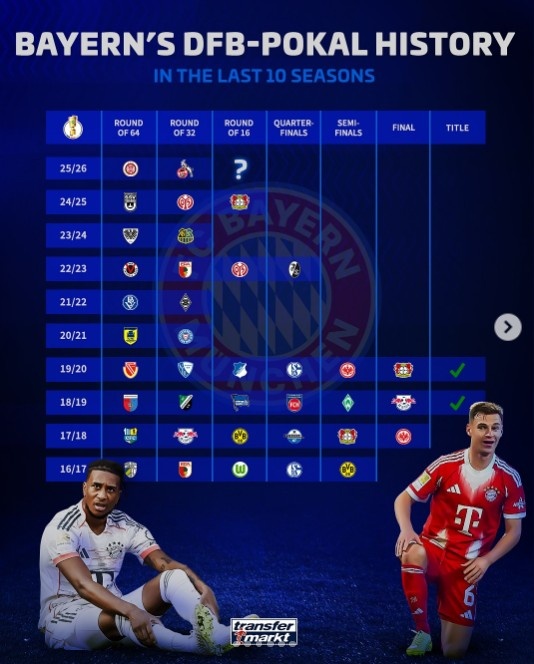 以下为拜仁近10个赛季在德国杯中的战绩: