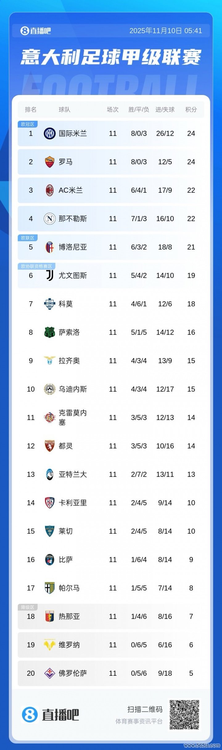 11月10日讯 本赛季意甲11轮战罢,国米与罗马同积24分位列积分榜前两位。