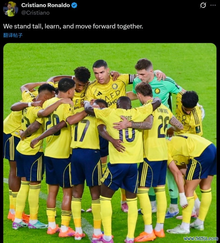 C罗在赛后通过社媒晒出全队围成一圈时自己的喊话照,并配文:“我们昂首挺胸,一起学习并且继续向前。”